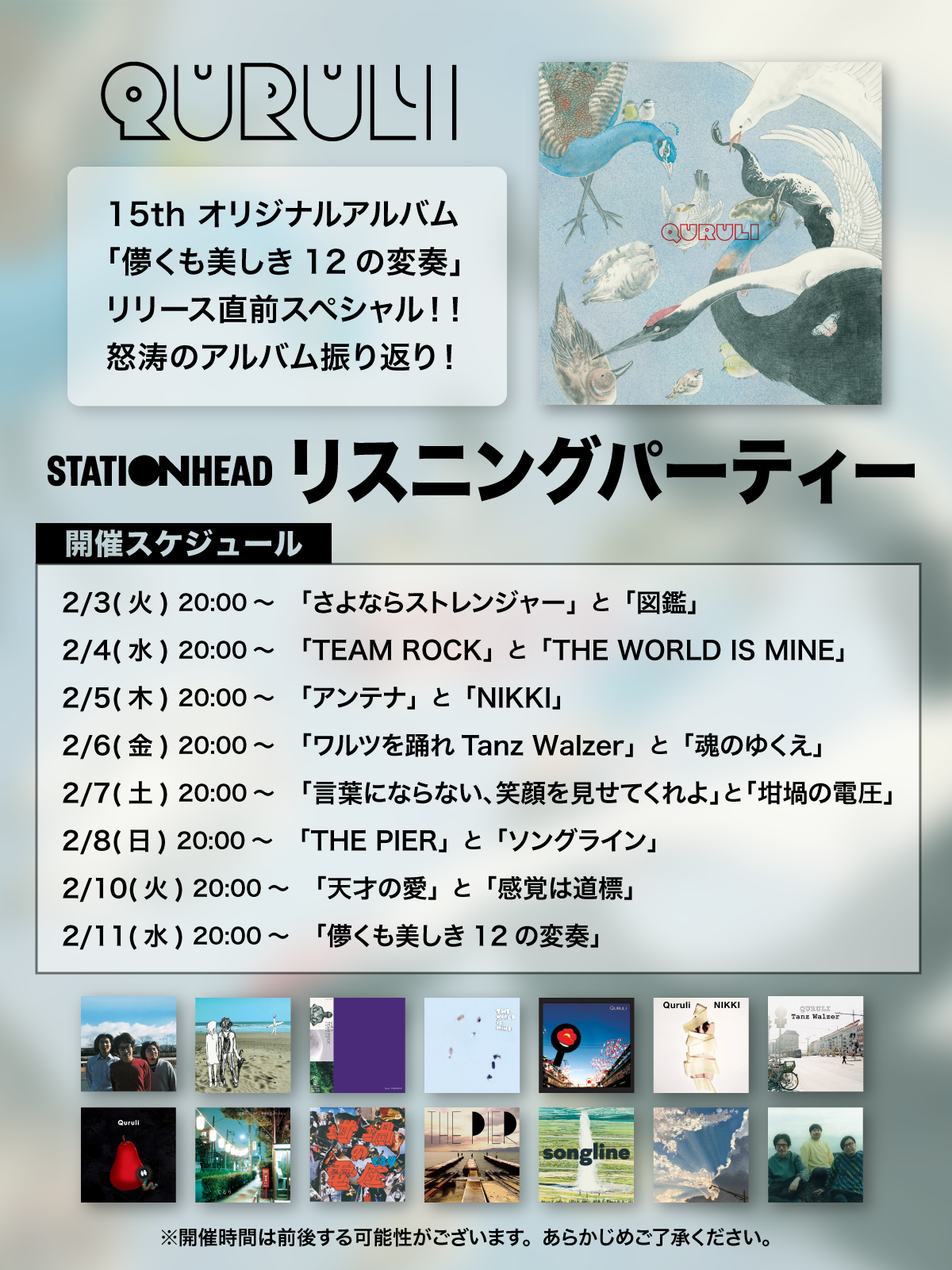 定期開催しているStationheadでのリスニングパーティー「くるりのすてへ」は、15枚目のアルバムリリースに向けて、これまでリリースした14枚のオリジナルアルバムを振り返る連続配信を2/3(火)から実施いたします。くるりの30年をたどれる配信となりますので、ぜひチャットにもご参加いただき、くるりとの思い出を語りながらニューアルバムリリース直前の配信をお楽しみください。